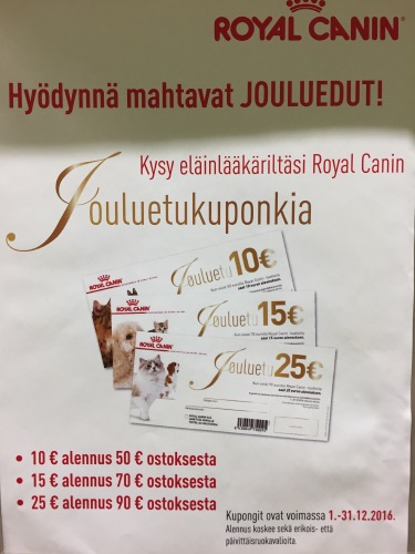 Joulu lähestyy. Tänäkin vuonna Royal Canin tarjoaa asiakkailemme jouluedun. Ostaessasi Royal Canin ruokia yli 50 eurolla, saat alennusta loppusummasta riippuen 10-25 €. Etu on voimassa sekä päivittäis- että erikoisruuista. Samalla voit liittyä Royal Canin kanta-asiakas ohjelmaan.